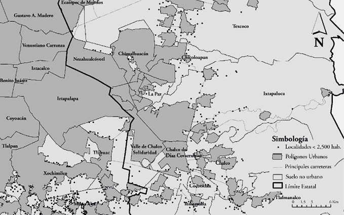 De las 1.714 localidades con menos de 2.500 habitantes, solo 15,7% son de reciente formación,6 por lo que puede pensarse en una consolidación e incremento poblacional en los asentamientos ya establecidos desde antes del año 2000. El crecimiento de la región se está manifestando claramente sobre un patrón de poblamiento de expansión hacia las orillas, principalmente en el oriente de la región, en territorios contiguos a la mancha urbana sobre el territorio no urbano, más que por un proceso de redensificación de la ciudad. Ahora, hay que dirigir la mirada a estos espacios con suelo no urbano y adentrarse en las condiciones socioterritoriales que motivan el desarrollo de pequeños asentamientos en las orillas de la metrópoli.