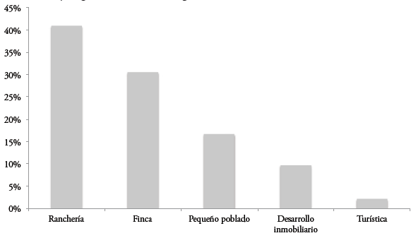 En esta categoría se clasifican todos aquellos asentamientos cuya localización es distante de un polígono urbano,14 y dispersa dentro del suelo de conservación de la metrópoli. Esta característica socioterritorial, en combinación con otros factores, facilita la conformación variada del territorio en cinco subcategorías: las rancherías, las fincas, los pequeños poblados, los desarrollos inmobiliarios y las localidades turísticas.