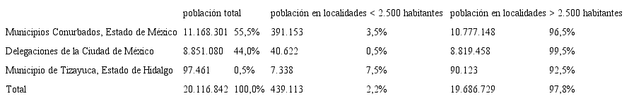 La zmvm está conformada por 20.116.842 habitantes (Inegi, 2010), de los cuales 55,5% se localiza en los municipios conurbados del Estado de México, 44% en la Ciudad de México y solo 0,5% en Hidalgo. De acuerdo con la tabla 1, solo 2,2% de la población metropolitana habita en las 1.714 localidades que cuentan con menos de 2.500 habitantes.