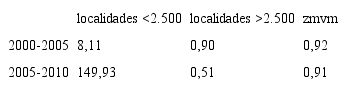 Respecto a las tasas de crecimiento poblacional (tabla 2), 69% de las localidades menores de 2.500 habitantes de la zmvm mostró un aumento superior a la media regional de 0,91% en el periodo 2005 a 2010. Se observa que las localidades con menos de 2.500 habitantes crecieron en la primera década del siglo xxi a una tasa de 110%, nivel muy superior a la media metropolitana, ya que pasaron de 36.769 habitantes en el año 2000 a 439.113 en 2010. Las localidades con menos de 2.500 habitantes crecieron nueve veces más que el resto de la región en el periodo 2000-2005; sin embargo, es significativo el dato de crecimiento cercano a 150% para el periodo 2005-2010 (tabla 2), mientras que se observa un despoblamiento en la parte de las localidades mayores de 2.500 habitantes, lo que podría pensarse como un éxodo urbano intrarregional.