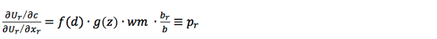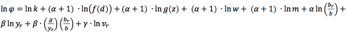 Si maximizamos la función de utilidad (ecuación 3), obtenemos la condición de primer orden (ecuación 6), en la cual el precio de los impuestos (pr) es el producto del costo marginal de la cobertura de los servicios urbanos básicos por la cuota tributaria. Suponiendo que la función de demanda es log-lineal (ecuación 7), y sustituyendo la ecuación (6) en la ecuación (7) y la formulación resultante en la ecuación (2), obtenemos la función log gasto (ecuación 8):