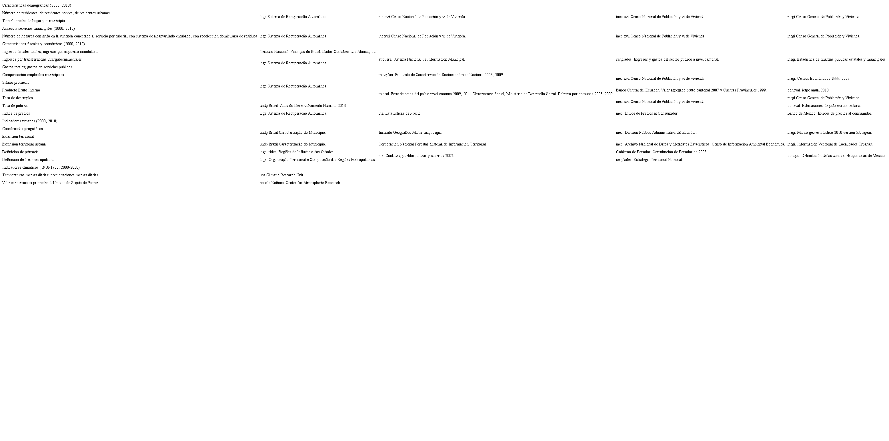 Indicadores urbanos. El municipio es la unidad geográfica más pequeña que podemos documentar. Utilizamos imágenes Landsat y datos de Sistemas de Información Geográfica (sig) para identificar zonas urbanas dentro de un municipio y obtener indicadores espaciales. Además, creamos dos variables binarias, una que indica si un municipio es una ciudad cabecera, y otra si pertenece a un área metropolitana. En cada país, seguimos las definiciones nacionales de estas variables (México: Secretaría de Desarrollo Social [Sedesol], Consejo Nacional de Población [Conapo], Instituto Nacional de Estadística y Geografía [Inegi], 2010; Brasil: Instituto Brasileiro de Geografia e Estatística [ibge], 2008; Chile: Instituto Nacional de Estadísticas [ine], 2005; Ecuador: Secretaría Nacional de Planificación y Desarrollo [Senplades], 2009).