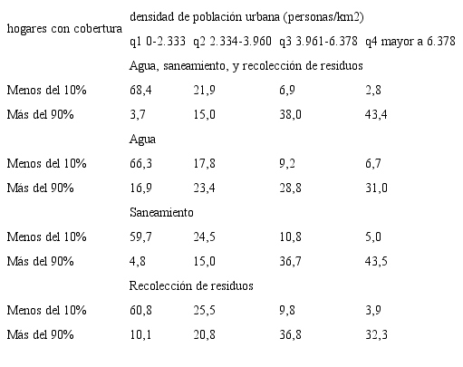 En este estudio, consideramos hogares con cobertura aquellos que reciben servicios urbanos básicos de alta calidad. El supuesto es que los hogares informales y rurales tienen más probabilidades de acceder a servicios mediante otras modalidades. Los hogares urbanos informales a menudo dependen de camiones de agua, alcantarillados abiertos y contenedores comunales de residuos de basura; mientras que los rurales utilizan pozos de agua, cámaras sépticas individuales y contenedores individuales de residuos (World Bank, 2014b). Además, considerar una única modalidad de cobertura mejora la comparabilidad de las estimaciones a la hora de evaluar el gasto público. Por último, desde un punto de vista normativo, los servicios urbanos básicos de alta calidad son lo que se espera para las áreas urbanas.
