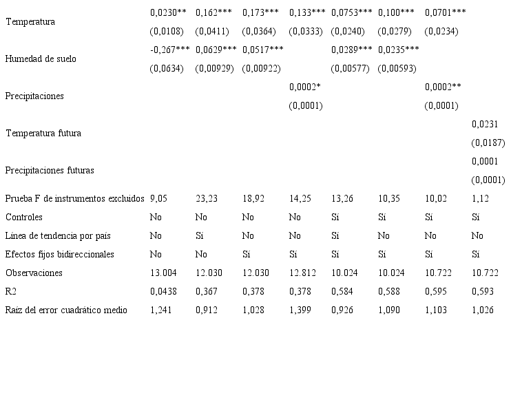 En esta sección se discute la capacidad de los instrumentos empleados en este trabajo para predecir la densidad de población corriente. Recuérdese que el conjunto de instrumentos incluye temperatura municipal retrasada, lluvia caída y condiciones de humedad del suelo. La relación de primera etapa entre este conjunto de instrumentos y la densidad de población siempre es significativa, observándose la asociación más fuerte entre humedad del suelo, temperatura y densidad urbana (tabla 4). La relación es también sólida e igualmente significativa cuando se incorporan controles para características municipales y efectos fijos bidireccionales, así como tendencias de tiempo específicas del país (regresiones 5-7, tabla 4).