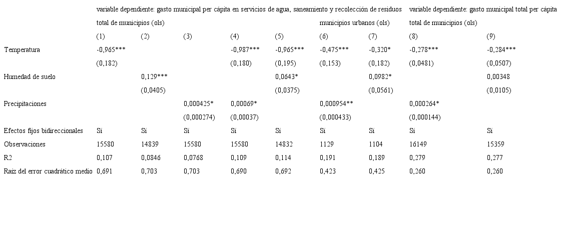 Finalmente, utilizamos una fuente exógena de variación para resolver la determinación simultánea de la densidad y gasto público. Siguiendo a Rosenthal y Strange (2003), Combes, Duranton, Gobillon y Roux, (2010), y Glaeser y Gottlieb (2009), empleamos variables climáticas como instrumentos de control. Nuestra estrategia se basa en la identificación de la ortogonalidad de estas variables a los cambios en los gastos de servicios urbanos básicos a nivel municipal, excepto cuando los cambios en el nivel de gastos se deben a la densidad de población. Aunque en las zonas rurales el clima tiene un efecto directo sobre los ingresos (Guerrero Compeán, 2013), nuestra estrategia de identificación es apropiada para las áreas urbanas, ya que el clima es un factor determinante de los patrones de asentamiento, pero no está fuertemente vinculado al crecimiento de los ingresos de la población (Miguel, Satyanath & Sergenti, 2004).