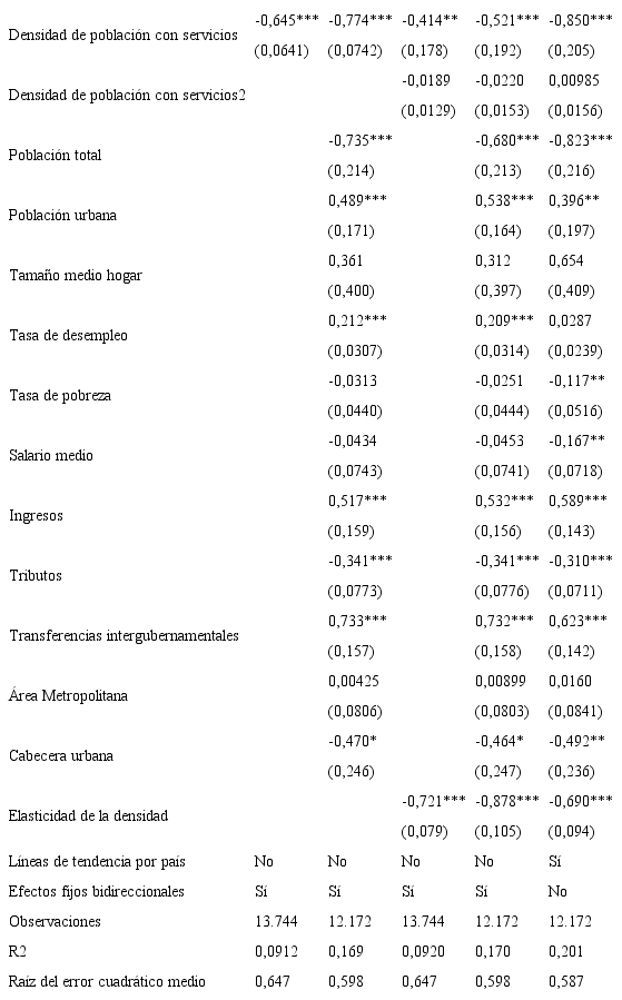 En resumen, la relación entre densidad de población y gasto público per cápita es significativa y, sin embargo, su dinámica es ambigua (Boyko & Cooper, 2011; Ewing, 1994). En el mejor de los casos, esta inconsistencia empírica puede deberse a diferentes definiciones de datos y unidades de análisis. Una preocupación más grave es que se deba a que los modelos utilizados no consideran apropiadamente la existencia de variables explicativas, resultando en una falta de identificación adecuada. Lo que es claro es que dos retos permanecen. El primero es empírico. La falta de datos en países menos desarrollados ha restringido los estudios a aquellos donde hay datos confiables a nivel local. Pero la falta de investigación empírica sobre los patrones de urbanización en los países en desarrollo lleva a recomendaciones de políticas mal informadas (Angel et al., 2005). Los modelos utilizados carecen de variables tales como porcentaje de hogares urbanos sin acceso a servicios básicos, la cual refleja una dinámica específica del proceso de urbanización en estos países (Libertun de Duren, 2011). El segundo reto es metodológico. La literatura no considera la determinación endógena entre gastos municipales y densificación, estableciendo simultáneamente los valores de densidad y de gastos, sin iluminar las dinámicas del crecimiento. En el caso de los países en desarrollo, donde suele existir un rezago considerable entre el asentamiento de la población y la provisión de servicios, esta indeterminación puede llevar a conclusiones erradas.