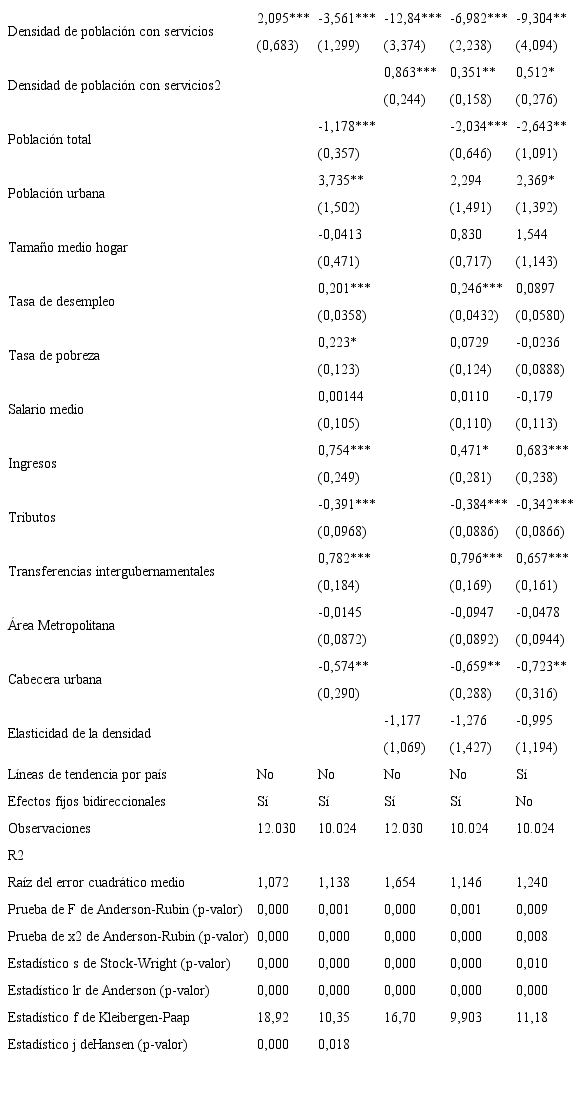 Se realizan estimaciones tanto de mínimos cuadrados ordinarios (ols) como de mínimos cuadrados de dos etapas con variables instrumentales (iv-2sls). Dada la anterior discusión teórica y análisis no paramétrico, se toman como referencia una iv-2sls no lineal con efectos fijos municipales, tendencias en el tiempo específicas de país, y especificaciones de controles. Así, a partir de este punto el énfasis será en los resultados de esta especificación (tabla 7b, columna 10). Los resultados son similares cuando se incluyen efectos fijos temporales. Se encuentra que la relación entre densidad urbana y gasto municipal en los servicios urbanos básicos por cabeza es fuerte y en forma de U, sugiriendo que existe un punto de densidad óptimo (el vértice de la parábola) más allá del cual se agotan las economías de escala. Un aumento en la densidad urbana conduce a gastos de servicios urbanos básicos per cápita más bajos en áreas urbanas dispersas y de tamaño mediano, pero un mayor aumento en la densidad de la población eleva significativamente los costos de prestar servicios urbanos básicos en jurisdicciones que ya son densas. Se identifica un punto de densidad óptimo en aproximadamente 9.000 habitantes/km2. Belém (Brasil), Santiago (Chile) y Puebla (México) se encuentran entre aquellas municipalidades cerca de la gama de densidad óptima (tabla 6). Se encuentra que la municipalidad promedio exhibe economías de escala cercanas a los 8.450 residentes, con un gasto de us$ 75 por residente en la prestación de servicios urbanos básicos.
