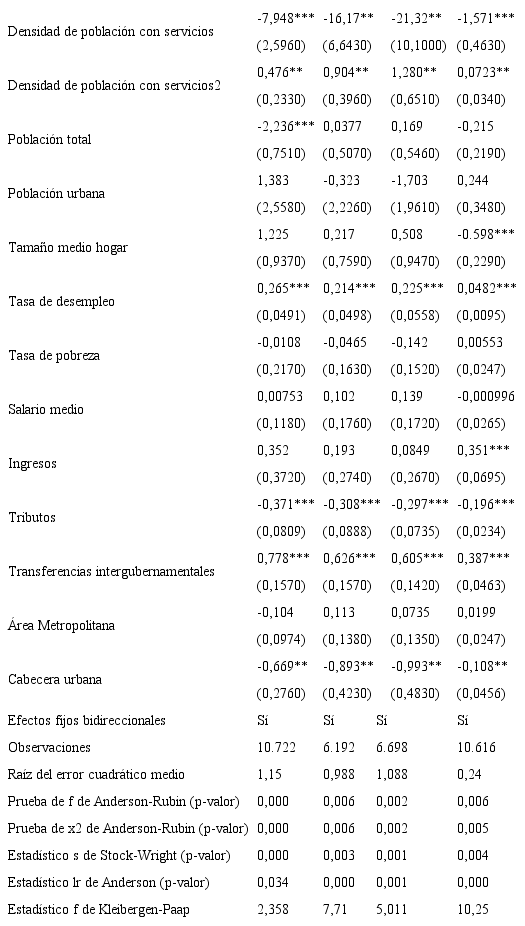 Los resultados de los efectos fijos iv-2sls son robustos a una variable dependiente alternativa. Cuando se considera la relación entre densidad urbana y gasto municipal total por cabeza –en oposición al gasto per cápita en servicios urbanos básicos–, se encuentra que la mayoría de las municipalidades exhiben economías de escala, con el punto mínimo encontrándose en una densidad de población de más de 50.000 personas por kilómetro cuadrado (regresión 4, tabla 8). De igual modo, la elección de instrumentos no cambia el significado estadístico de estos resultados. La densidad de población urbana no tiene un impacto estadísticamente diferencial sobre el gasto en servicios urbanos básicos por habitante (tanto para las especificaciones agrupadas como solo urbanas) cuando se incluye la precipitación como instrumento adicional (regresiones 1 y 3, tabla 8).