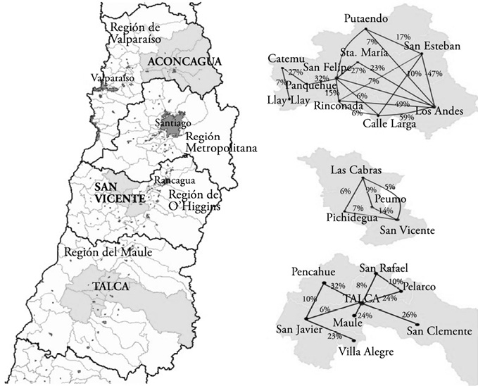 Los territorios seleccionados corresponden a las comarcas de Aconcagua, en la Región de Valparaíso; San Vicente de Tagua Tagua, en la Región de O’Higgins; y Talca, en la Región del Maule. La delimitación de estas tres comarcas se basó en la estimación del grado de intensidad de la conmutación laboral intercomunal. Para ello usamos el índice propuesto por Tolbert y Killian (1987), que pondera el volumen bruto de desplazamientos entre dos comunas con respecto a la población de las comunas involucradas.