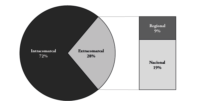 En las tres comarcas destaca que solo el 9% (8000 trabajadores) corresponde a commuters que se desplazan hacia alguna localidad fuera de su comarca pero dentro de su entorno regional inmediato. Asimismo, el 19% (16.000 trabajadores) corresponde a commuters extrarregionales, conformando lo que se conoce como conmutación de larga distancia (figura 2). En conjunto, estos datos indican el bajo nivel de interacción que estas comarcas tienen tanto respecto a su entorno regional inmediato, como con el resto del país. Por el contrario, los desplazamientos al interior de la comarca muestran una situación muy diferente, y representan el 72% (64.000 personas) del total de los trabajadores que conmutan.