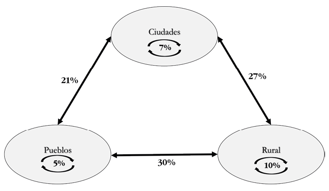 Los datos señalados indican que, contrariamente a lo que se hubiera esperado, no son los desplazamientos del campo hacia las grandes ciudades los de mayor relevancia cuantitativa. Ni las localidades rurales son las principales fuentes de origen de la conmutación, ni las grandes ciudades son las principales receptoras de esos desplazamientos. En estos territorios, la presencia de pueblos y ciudades pequeñas (con menos de 20.000 habitantes) resulta de gran importancia en la configuración de las trayectorias y desplazamientos de la fuerza de trabajo, como lugar tanto de origen de los flujos como de destino de los mismos. Se trata de un sistema de desplazamientos a tres bandas, donde lo relevante no es cuánto gana o pierde cada uno de los actores (ciudades, pueblos, localidades rurales), sino la intensidad de los flujos que se da entre ellos. Al respecto, considerando el peso específico de cada flujo, se observa que prácticamente no hay un tipo de flujo origen/destino que predomine por sobre los otros. De hecho, el flujo más importante es el que se da entre los pueblos y las localidades rurales, el cual concentra el 30% del total de trabajadores que conmutan (figura 3). Se trata de una cifra que supera levemente el flujo entre localidades rurales y ciudades, el cual involucra al 27% del total de trabajadores commuters de las tres comarcas. Solo el flujo entre pueblos y ciudades se ve con menor peso, pero aun así involucra a uno de cada cinco trabajadores que conmutan.
