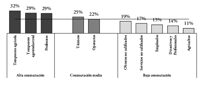 Finalmente, están las ocupaciones de muy bajo nivel de movilidad cotidiana. Entre ellas se identifican oficios y puestos de trabajo muy diversos y que se ubican en distintos estratos de la estructura ocupacional. Por un lado, se tiene a los directivos y gerentes de empresas, así como a los profesionales. Se trata de ocupaciones de los niveles más altos de la jerarquía laboral. En este caso, la tasa de movilidad es muy baja y no llega al 15% de los trabajadores. Asimismo, están los empleados y oficinistas, quienes presentan una tasa de conmutación de solo el 15%, muy inferior al promedio comarcal. A su vez, los trabajadores en servicios personales y no calificados (servicio doméstico, trabajadores de limpieza y mantenimiento, entre otros), junto a los obreros no calificados, tienen un nivel de conmutación algo mayor, pero no supera el 19%, siendo aún inferior al promedio comarcal. Por último, cabe señalar el caso de los pequeños agricultores y campesinos propietarios de tierras. Son quienes muestran la menor tasa de movilidad, y reflejan precisamente el contraste con los otros trabajadores agrícolas (temporeros y jornaleros). El mantener la propiedad de sus tierras configura una situación de baja movilidad territorial, pues en lo general, su lugar de trabajo tiende a coincidir con su lugar de residencia.