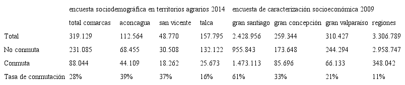 Por comarcas, la situación no es homogénea. Mientras Aconcagua y San Vicente muestran altas tasas de conmutación, cercanas al 40%, en Talca la proporción de trabajadores commuters se reduce al 16% de la población ocupada, cifra en todo caso superior al promedio nacional. Este menor índice de conmutación se debe al gran peso de la ciudad de Talca, que por sí sola concentra casi el 60% de la población ocupada de esta comarca a la vez que el 61% de los puestos de trabajo. En otras palabras, una muy alta proporción de los trabajadores reside y trabaja en la ciudad de Talca, reduciendo así la proporción de trabajadores que conmutan cotidianamente entre su localidad de residencia y la de trabajo.