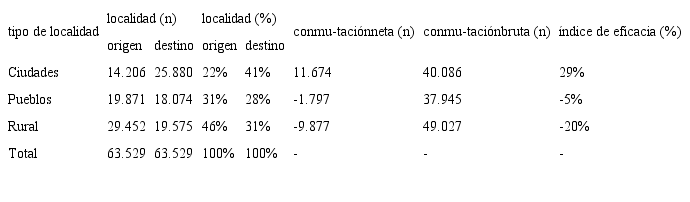 Al respecto, los datos indican que, en general, cada localidad tiene una muy baja eficacia global, es decir, que lo que ganan o pierden por conmutación es una muy baja proporción del total de trabajadores que se desplazan desde o hacia ese tipo de localidad (tabla 2). En el caso de las ciudades, de cada diez trabajadores commuters solo tres representan una ganancia neta para ese tipo de localidades. Asimismo, en el caso de las localidades rurales, aun cuando la conmutación implica una pérdida neta de trabajadores, lo cierto es que por cada cinco trabajadores que en su desplazamiento involucran una localidad rural, solo uno representa una pérdida neta para este tipo de localidades. En el caso de los pueblos esta situación es aún más evidente, pues en ellos el saldo neto es muy cercano a cero. De esta forma, solo uno de cada veinte trabajadores que se desplazan por pueblos, involucra una pérdida neta para estas localidades.
