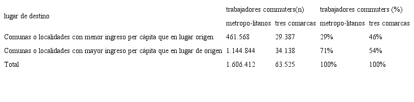 La tesis de la conmutación como flujo compensatorio entre localidades urbanas y rurales imprime un carácter específico y diferente al papel que ella representa respecto del que desempeña en otros contextos. En las comarcas estudiadas la conmutación opera más como un mecanismo de integración territorial y no tanto como un modo de segregación residencial, a la manera de lo que ocurre en las grandes zonas metropolitanas (Rodríguez, 2008). En efecto, en las zonas metropolitanas la dinámica de la conmutación indica que los trabajadores se desplazan desde comunas de bajos ingresos hacia otras de altos ingresos, ilustrando la desigual distribución territorial de los empleos y de la fuerza de trabajo, a la vez que da cuenta de la forma e intensidad que asume la segregación residencial socioeconómica en las grandes ciudades, como el Gran Santiago. Según se observa en la tabla 3, en las zonas metropolitanas conmuta el 54% de los trabajadores. De ellos, el 71% se desplaza a comunas donde el ingreso per cápita es superior al de sus comunas de residencia, y solo el 29% hace la trayectoria compensatoria inverso.