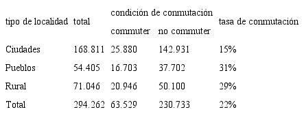 En cuanto al peso de la conmutación en la configuración de los mercados laborales locales, los datos indican que en los pueblos y localidades rurales, la conmutación pasa a ser un componente fundamental en la composición de la fuerza de trabajo empleada; en las ciudades, en tanto, aunque no deja de ser importante, su peso relativo es menor.