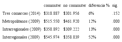 Lo relevante es que esta situación contrasta con lo observable a nivel nacional, especialmente respecto a la conmutación de larga distancia. En este caso, los datos indican que las diferencias salariales son superiores al 50% a favor de los trabajadores que conmutan. Asimismo, en el caso de los commuters intrametropolitanos así como los de corta distancia (intrarregionales), las diferencias salariales, aunque son menores y no llegan al 15%, son estadísticamente significativas y también favorecen a los trabajadores que conmutan.