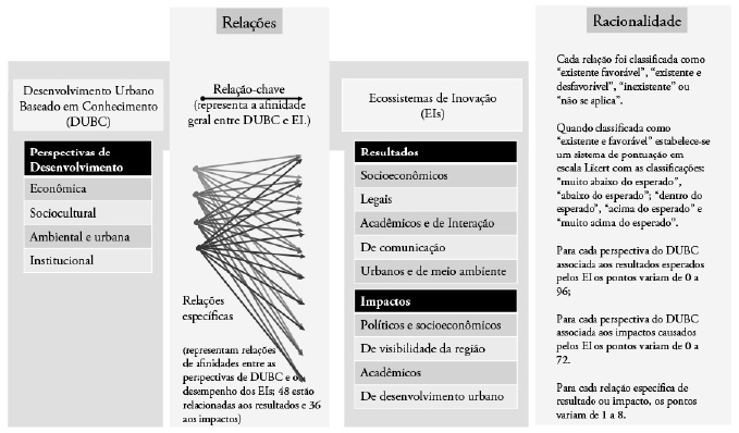Determinantes oriundos das duas áreas foram organizados em um modelo inicial que racionalizou as relações por meio de um processo de dedução tradicional (figura 1). O dubc produziu as variáveis independentes e os ei as variáveis dependentes do modelo. O foco está em relações causa-efeito, sendo as causas as perspectivas estratégias do dubc e os efeitos o desempenho dos ei. Ao todo, 85 relações são analisadas. Duas delimitações são apresentadas pelo modelo: i) não são consideradas relações contrárias dos ei para o dubc (situações onde os resultados e impactos influenciam uma ou várias perspectivas) e ii) não há consideração de relações desfavoráveis. Esta opção permite focar prioritariamente na identificação de recomendações para os formuladores de políticas públicas e planejadores urbanos envolvidos com o dubc.