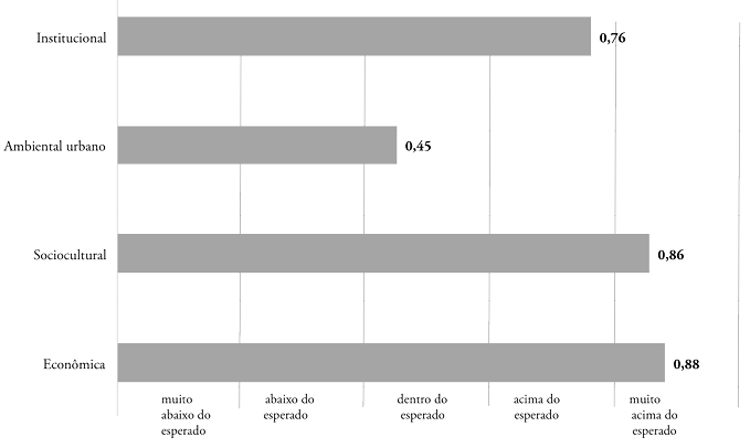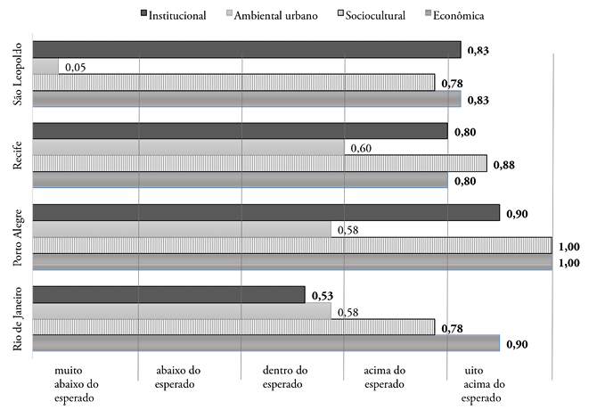 Na análise dos casos selecionados, a perspectiva ambiental e urbana é a que menos influenciou positivamente os ei, obtendo uma percepção conjunta como “dentro do esperado” (figura 2). Especificamente se sobressaem Recife, Porto Alegre e Rio de Janeiro, todas “dentro do esperado” (figura 3). Chama a atenção para percepção de São Leopoldo considerada “muito abaixo do esperado”. Cabem as seguintes avaliações específicas: