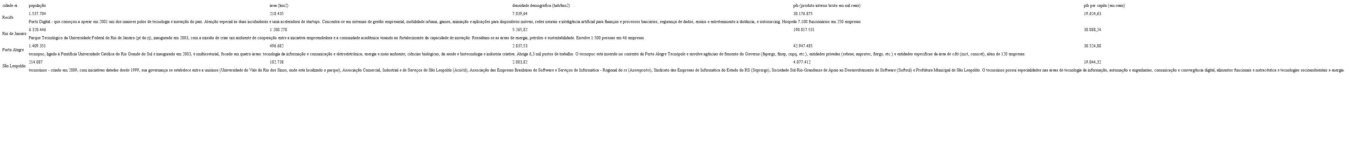 A presença de centros de formação de trabalhadores do conhecimento é facilmente percebida nas quatro cidades, uma vez que Universidades estão entre os principais stakeholders, confundindo-se com as próprias atividades dos ei. No Porto Digital, há a participação de uma instituição de ensino superior, o Cesar.edu, iniciativa do Centro de Estudos e Sistemas Avançados do Recife (cesar). A gênese do Tecnopuc de Porto Alegre é a Pontifícia Universidade Católica do Rio Grande do Sul, ainda principal stakeholder do ei. No Rio de Janeiro a participação da Universidade Federal do Rio de Janeiro ocupa a posição de principal provedora de egresso para o pt da ufrj. Já o Tecnosinos de São Leopoldo apoia-se fortemente na Universidade do Vale do Rio dos Sinos.