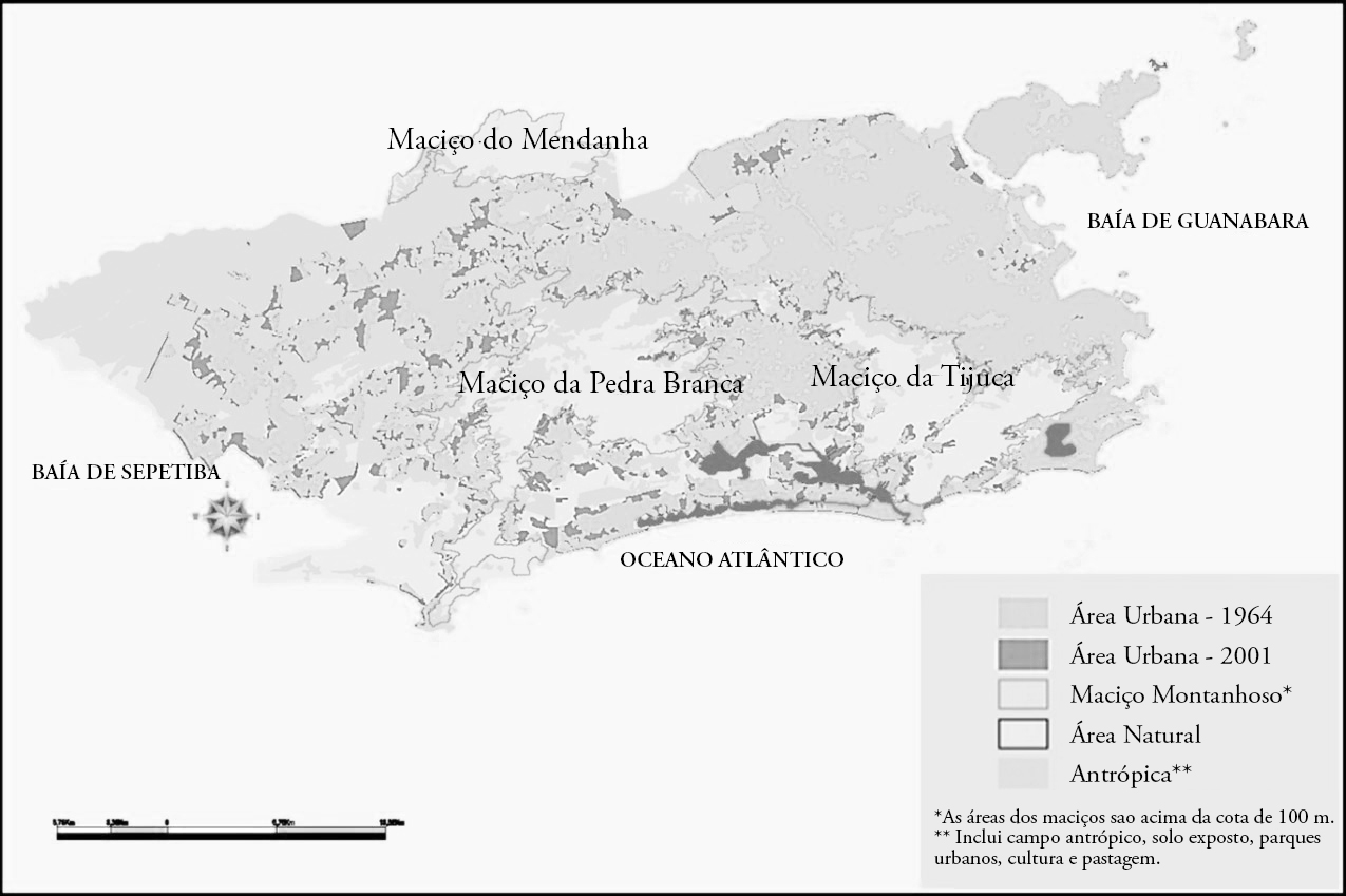 Apesar da importância das áreas naturais para o município, não só por seus serviços ambientais, mas também por fazer parte da imagem cultural da cidade, um recente estudo de indicadores e mapeamentos de uso e ocupação do solo realizado pelo Instituto Municipal de Urbanismo Pereira Passos (ipp) em parceria com a smac apresentou um quadro crítico dessa situação. A partir do diagnóstico produzido, dois fatores que influenciam essa pressão sobre as áreas naturais foram identificados: 1. O crescimento urbano e econômico da cidade em direção, principalmente na Zona Oeste (aps 4 e 5); 2. O crescimento de áreas favelizadas e da ocupação ilegal em áreas de preservação (tanto pela população pobre com a formação de favelas, quanto pela população rica, em busca de melhor qualidade de vida que foge da conturbação urbana e busca maior contato com a natureza). Esse último especialmente preocupante, pois além da perda de áreas naturais acarreta também à cidade sérios problemas relacionados à vulnerabilidade ambiental (smac, 2005). Nas Figuras 1 e 2, pode-se observar o contrate da redução das áreas naturais que coincidem com a expansão das áreas urbanas entre os anos de 1985 e 2001.