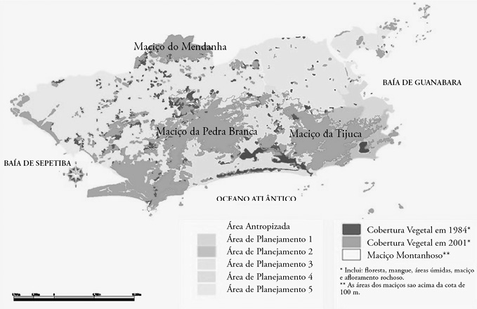 A despeito dos problemas ambientais característicos de áreas características do grande adensamento urbano, a conservação de uma grande área florestada na cidade do Rio de Janeiro foi proporcionada por suas características geográficas. A cidade do Rio de Janeiro encontra-se inserida em um vale delimitado por três maciços, Tijuca, Pedra Branca e Gericinó, mais a planície costeira. Assim, parte significativa das áreas conservadas está localizada em áreas íngremes e de difícil ocupação. Tal fato, em conjunto com sua localização costeira, levou à formação de uma cidade praticamente inserida dentro de áreas naturais.