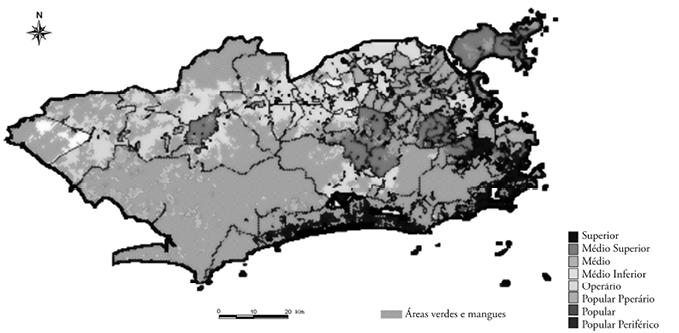 Ainda de acordo com o documento produzido (ipp, 2001), duas situações, contudo, rompem com esta lógica socioterritorial. A primeira é a presença de espaços médio-superiores e médios na Zona Oeste que apresenta tendências à diversificação social de parte da periferia. A segunda situação está relacionada com a presença das favelas (espaços do tipo popular e operário) nas áreas superiores: “traço característico do modelo de segregação urbana3 vigente na Cidade do Rio de Janeiro, que combina distância social com proximidade física” (ipp, 2001, p. 6).