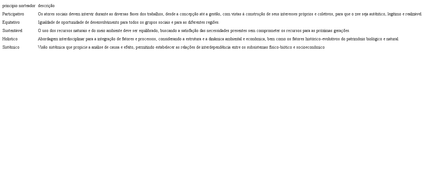 Segundo o mma (2006a), a elaboração do zee é dividida em quatro etapas principais, a saber: planejamento, diagnóstico, prognóstico e subsídios à implementação, cada qual com suas subdivisões. Em uma visão generalizada, o zee parte de uma abordagem ampla de detecção de problemas e métodos a serem aplicados na busca de solução desses problemas. Do ponto de vista operacional, os resultados obtidos deverão ser considerados para a elaboração de estratégias e políticas, buscando encontrar os meios exatos para integrar variáveis ambientais, sociais e econômicas envolvidas nos projetos. Todas as etapas são conduzidas segundo os princípios norteadores apresentados no tabela 1.