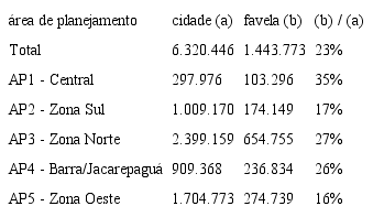 Estima-se que em 2010 a população residente nessas áreas correspondia à 23% do total da população da cidade (1.443 mil habitantes) (ipp, 2012). Essas áreas estão espalhadas por todo o território urbano da cidade (tabela 2). Em termos absolutos a ap3 (Zona Norte) é a que concentra a maior população vivendo em favelas (654.755 habitantes). Em termos relativos, a ap1 (Centro), é a região com a maior proporção de pessoas vivendo em favelas em relação a população total da região (35%) (ipp, 2012). As favelas possuem inúmeros problemas sociais que espelham a desigualdade presente na cidade, sendo também a parte do espaço urbano com maior carência de infraestrutura (saneamento, espaços públicos, áreas verdes, urbanização etc.) e de ordenamento territorial. Trata-se de um espaço de segregação social, onde se concentra a parcela mais pauperizada da população. Essa é a parte do território representa também um desafio de planejamento e ordenamento territorial visando à melhoria da qualidade de vida da população.