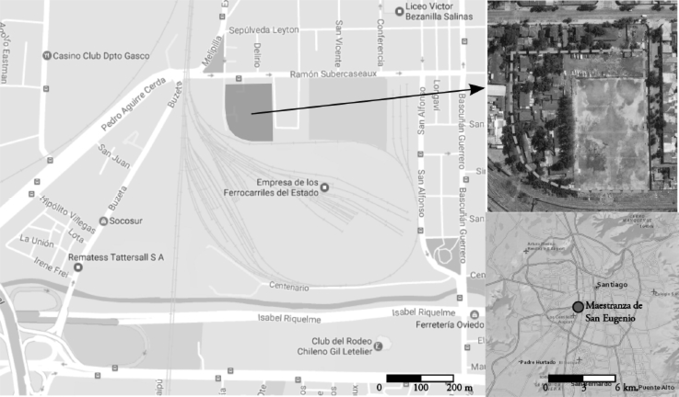 La Maestranza de San Eugenio, una de las áreas de talleres ferroviarios más importantes de Santiago, comenzó a ser construida en 1905, cuando la Empresa de los Ferrocarriles del Estado compró 147.762 m2 de terreno al sur de la Estación Alameda de Santiago (Ortega, 2013, p. 44). Junto a esta Maestranza y estación, comenzaron a surgir diversas industrias y talleres, y con ellos, los primeros barrios obreros, como la Población San Vicente, surgida en 1894, o la Población San Eugenio para ferroviarios, inaugurada en 1911 (Ibíd., p. 47). Durante décadas, la Maestranza de San Eugenio y sus industrias anexas constituyeron todo un símbolo de la industrialización del país, pero a comienzos de los años setenta, con la crisis del petróleo y la instauración del régimen militar, comenzó la decadencia del ferrocarril y, con ella, la de la propia Maestranza. Los planes del nuevo gobierno militar y su programa neoliberal se decantaron por desregular el transporte de pasajeros y por desmantelar la tupida red de ferrocarriles existente hasta esa época, en respuesta al déficit que arrastraba la compañía estatal (Thomson, 2012). Aunque los talleres ferroviarios siguieron funcionando, gran parte de la Maestranza y sus fábricas anexas fueron cerrándose, comenzando así un progresivo deterioro que dura hasta hoy. Algunos equipamientos importantes acabaron siendo derribados, como el histórico estadio Hugo Arqueros Rodríguez en el que jugaba el equipo de fútbol fundado por trabajadores de la Maestranza, que fue desmantelado en 2012. De esta manera, desde los años noventa quedó sin uso un inmenso conjunto de sitios de unas 35 hectáreas, en una posición central en la metrópoli (junto a las autopistas Central y del Sol, en el límite entre la comuna central de Santiago y la de Estación Central); por lo tanto, una localización muy interesante para el desarrollo inmobiliario.