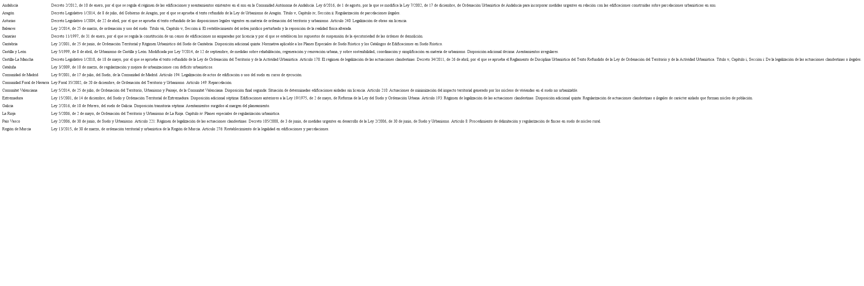 En tercer lugar, todas las cc.aa. han formado los parámetros para regularizar las actuaciones ilegales o clandestinas (tabla 2). De esta forma, se propone un reconocimiento de la situación jurídica de las edificaciones sobre la base del respeto de los principios de igualdad, equidad, proporcionalidad y legalidad. Ante la imposibilidad de respetar estos principios, pero situándose dentro de unos límites fijados por las normas, se han establecido modelos de asimilación de las edificaciones al régimen de fuera de ordenación. Esto significa que estas viviendas podrán seguir existiendo, aunque no podrán ser ampliadas, sino simplemente restauradas o mejoradas.