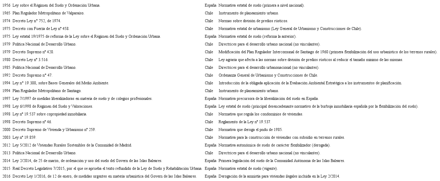 La multiplicación de estos instrumentos, aun siendo el medio adecuado para la ordenación urbana, no ha resultado definitoria para alcanzar los objetivos planteados. Los vaivenes legislativos han pervertido su cometido al facilitar un modelo de expansión urbana difusa. Tras esta legitimación de la expansión urbana desmedida se encuentran ideologías liberales, presentes en los marcos normativos estatales como el Decreto con Fuerza de Ley (dfl) nº 458 de 1975, General de Urbanismo y Construcciones de Chile (lguc) o, de forma meridiana, la Ley 7/1997, de 14 de abril, de medidas liberalizadoras en materia de suelo y de colegios profesionales, del Gobierno de España, cuyas ideas se afianzarían posteriormente en la lrsv.