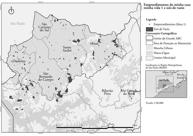 Os municípios da Região do Grande abc, que possuem limitado estoque de terras vazias e disponíveis para usos urbanos, de forma geral, delimitaram expressivo montante delas como zeis de vazios, e sua grande maioria é de áreas adequadas e com boa inserção urbana. Constatou-se que 88,8% da produção do pmcmv, na Faixa 1, deram-se em áreas demarcadas como zeis de vazio. A pesquisa realizada por Diniz (2015) apontou que a maioria dos empreendimentos do pmcmv, na região, está localizada em áreas adequadas e, dentre eles, aquele classificado como de melhor inserção urbana é o Conjunto Vitória –Faixa 1/fds– 228 uh localizado na área central do município de Diadema, gravada como aeis.