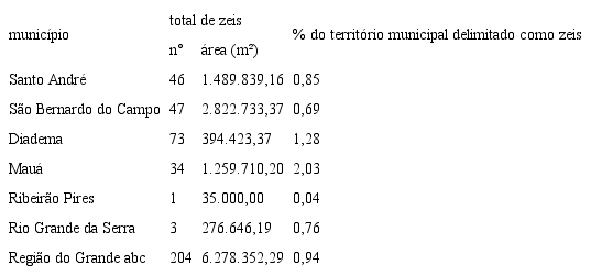 Na Região do Grande abc, foram demarcadas como zeis de vazios 6.278.352,29 m², sendo 4.637.019,37 m² (76,89%) reservados para produção de his, 1.124.984,98 m² (22,73%) foram utilizados para esse fim e 3.487.163,10 m² (77,27%) ainda estão disponíveis para produção de his.