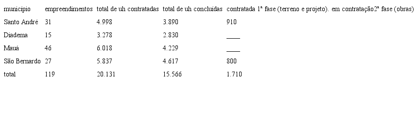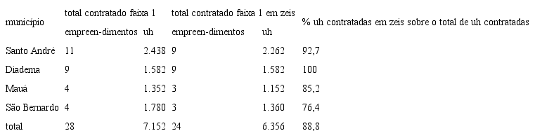 Foram contratadas, no abc paulista, 20.131 unidades do Programa Minha Casa Minha Vida, distribuídas em 119 empreendimentos,17 nos municípios de São Bernardo do Campo, Santo André, Diadema e Mauá,18 segundo dados levantados até o primeiro semestre de 2016.19 Deste total, 15.566 estão concluídas, o que representa 77,3% desta produção, 2.855 encontram-se em obras e 1.710, na modalidade Entidades, aguardam contratação, pois neste subprograma as obras são contratadas em duas etapas: a primeira referente à compra do terreno e ao projeto, e a segunda refere-se à obra física dos empreendimentos.