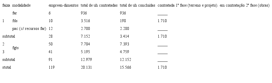 Assim, toda a Faixa 1 soma os seguintes números: 7.152 unidades contratadas, das quais 3.414 foram concluídas, 2.028 estão em obras, e 1.710 aguardam contratação para a fase de obras. O panorama das Faixas 2 e 3 operadas pelo fgts é o seguinte: na Faixa 2, foram contratadas 7.784 unidades, das quais 7.393 foram concluídas, ou seja, 95% de eficácia, e 391 unidades encontram-se em obras. Quanto à Faixa 3, foram contratadas 5.195 unidades, das quais 4.759 foram concluídas, o que representa 91% de eficácia, e 436 unidades estão em obras.