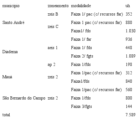 Também reconhecemos que não se pode atribuir apenas às zeis os resultados alcançados na região. É preciso considerar que os municípios que receberão o maior número de empreendimentos são aqueles com alta densidade e limitado estoque de terras vazias, portanto, o leque de escolhas de áreas não é grande. As características do mercado de terras, grau de urbanização, modelagem de financiamento, entre outros, são fatores que contribuem para definir a localização dos empreendimentos.