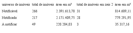 A prefeitura notificou 45 propriedades para peuc que correspondem a 1,7 milhão de m², e 12 desses (cerca de 650 mil m²) correspondiam a áreas delimitadas como zeis (Denaldi & Bruno Filho, 2012, p. 105).