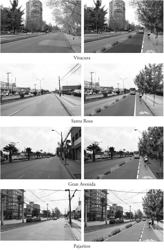 Se trató de mantener la composición de las imágenes igual para cada sector; i.e. que la estructura de la imagen fuera la misma, tomada desde el mismo punto y con puntos de fuga similares. Las variaciones o incorporaciones en la imagen se realizaron solo en el costado derecho de esta, con el fin de que los encuestados fueran capaces de reconocer su sector manteniendo constante el costado izquierdo. En la figura 1 se pueden ver las imágenes originales y modificadas de los cuatro sectores. El orden es Vitacura, Santa Rosa, Gran Avenida y, finalmente, Pajaritos.