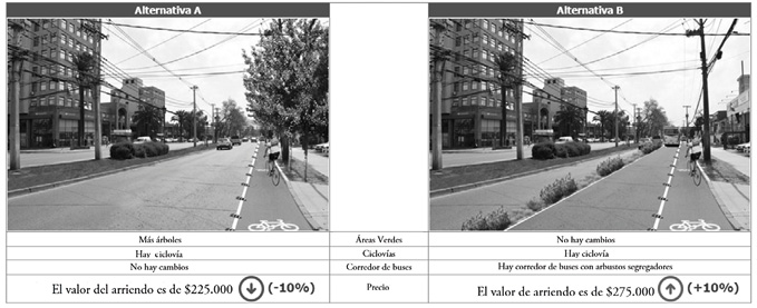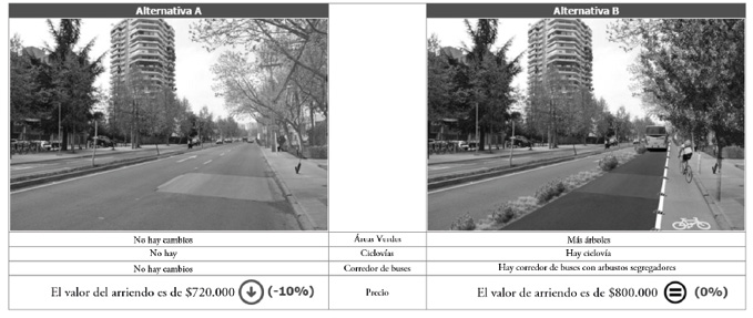 En el caso de esta investigación, para la formulación de alternativas se consideraron variaciones en tres atributos principales de la calle: áreas verdes, ciclovía y corredor de buses. Se crearon distintas imágenes para cada una de las avenidas estudiadas, que tenían diferentes combinaciones de estos atributos, junto con un valor de arriendo ficticio. A los encuestados se les presentaban seis preguntas con dos imágenes cada una, y tenían que elegir en cuál de ellas preferirían vivir, considerando que únicamente se produce una variación en el entorno y no en las características de su vivienda, con la excepción del valor de arriendo o venta. A partir de estas respuestas, es posible estimar modelos de elección discreta y conocer las preferencias de los usuarios por atributos urbanos en los distintos barrios, y al mismo tiempo cuánto estarían dispuestos a pagar por tenerlos en su entorno.