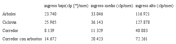 En cuanto a los árboles en la vereda, también fueron valorados positivamente por todos los niveles de ingreso. Con esto, se confirma el reconocimiento del arbolado de las calles como un elemento determinante de la habitabilidad del espacio público, tanto en las condiciones directas de confort ambiental (temperatura y asoleamiento) como en la continuidad de los ecosistemas del medioambiente urbano. Pero las áreas verdes no solo fueron consideradas a través del aumento de árboles, sino también a través de su acompañamiento a un corredor de buses con arbustos segregadores en su eje. La limitación en la valoración de este atributo recae en la unidad de medición, ya que se consideró como una mejora en verde, sin magnitud, siendo que sería preferible contar con una valoración en metros cuadrados, o cantidad y tipo.