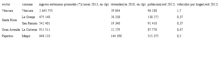 Para la verificación de la metodología propuesta, se seleccionaron segmentos de cuatro avenidas de Santiago de Chile que fuesen ejes estructurantes del sistema de transporte público, con y sin corredores de buses construidos, y emplazadas en sectores de características socioeconómicas diversas. De esta manera, se seleccionaron segmentos de cuatro avenidas: Vitacura, Santa Rosa, Gran Avenida y Pajaritos (tabla 1).