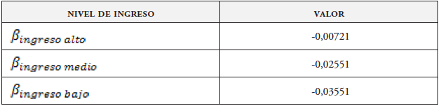 Al incorporar las interacciones entre el precio de arriendo con los ingresos familiares, el modelo se explica mejor, y los resultados ya tienen un sentido concreto. Con estos valores de los parámetros se puede saber la valoración de los atributos urbanos para los tres niveles de ingresos. Se dejó como base el ingreso alto; los parámetros para las personas de ingresos medios y bajos corresponden a la suma entre el parámetro base (ingreso alto) y el parámetro correspondiente a cada ingreso. En la tabla 4 se muestra el parámetro asociado a cada nivel de ingreso.