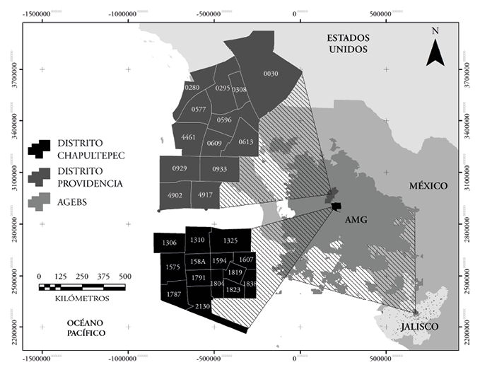 Los distritos se ubican al poniente de la ciudad (figura 1).1 Surgieron como barrios residenciales periféricos y son producto de procesos de intervención pública y especulación urbana. Su construcción sirvió para mantener viva la segregación socioespacial oriente-poniente que ha caracterizado a Guadalajara desde su fundación en 1542. Sin embargo Chapultepec y Providencia han registrado procesos históricos de desarrollo urbano y comercial distintos.