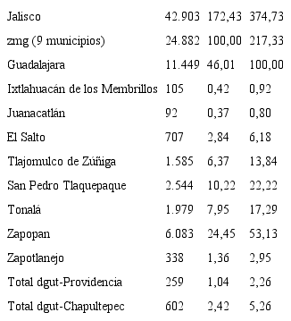 En Guadalajara, con una población metropolitana estimada en 2010 de 4.434.878 habitantes (Secretaría de Desarrollo Social [Sedesol], Consejo Nacional de Población [Conapo] & Instituto Nacional de Estadística y Geografía [Inegi], 2012), se tienen ubicados cuatro distritos que se aproximan al concepto de dugt propuesto: el triángulo Plaza del Sol-Chapalita-Expo Guadalajara (centro-sur), el distrito Chapultepec (centro-poniente), el centro de Tlaquepaque (oriente) y el distrito de Providencia (noroeste). Extrapolando ese dato a nivel nacional, y dada la existencia de 59 zonas metropolitanas formadas por 367 delegaciones o municipios en donde viven 63,8 millones de personas (Sedesol, Conapo & Inegi, 2012), el potencial de la existencia de dugt oscila entre 59 y 64 para contar con un distrito por cada millón de habitantes y alrededor de 400 si cada municipio metropolitano tuviera por lo menos uno.
