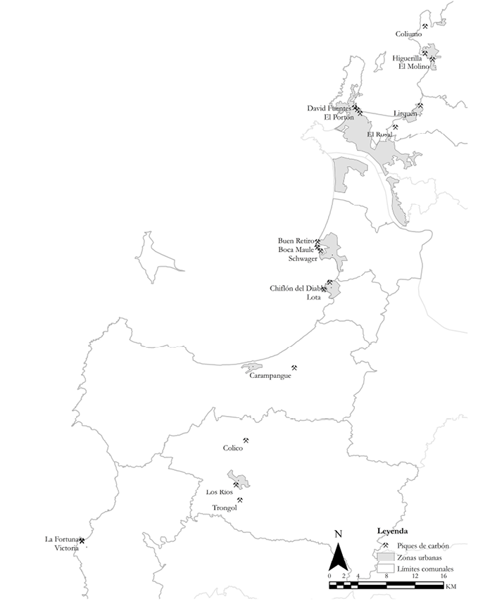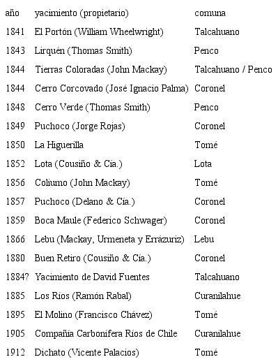 Si bien desde tiempos de la colonia se conocía la presencia de mantos carboníferos en el borde costero de Concepción en Chile, la extracción de carbón comenzó luego de la liberalización del puerto de Talcahuano. Desde la década de 1820, marinos británicos comenzaron a extraer carbón superficial para abastecer a sus naves de modo rudimentario (Mazzei de Grazia, 1997). Por otra parte, la expansión de la navegación comercial obligaba a buscar zonas de abastecimiento de combustible para las naves que cruzaban el estrecho de Magallanes. La explotación industrial del carbón comenzó recién en 1841, cuando el estadounidense William Wheelwright dio inicio a la explotación del primer yacimiento de carbón en el sector El Morro de Talcahuano (Danus & Vera, 2010, p. 54),2 para satisfacer las necesidades de las naves que recalaban en dicho puerto. A esta primera explotación le siguieron varias otras en distintas localidades vecinas (tabla 2).