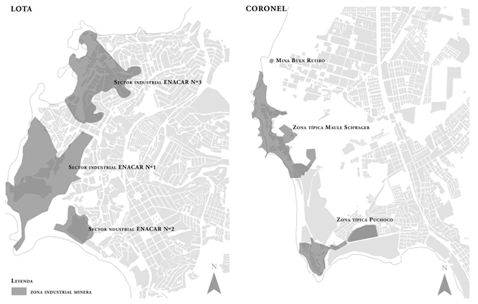 En el caso chileno, los planes de reconversión no consideraban el aprovechamiento o reutilización de los inmensos terrenos que ocupaban las instalaciones industriales (figura 3). En Lota, sin un plan de gestión de los recintos 1 y 2 de Enacar, que concentran la gran mayoría de los Monumentos Nacionales, sus instalaciones se deterioraron rápidamente, derrumbándose la cabria del pique Alberto a comienzos de 2017. En Coronel, por su parte, los recintos mineros consideraban las actuales Zonas Típicas de Maule y Puchoco, lo cual tampoco asegura la supervivencia de las construcciones patrimoniales, altamente deterioradas.