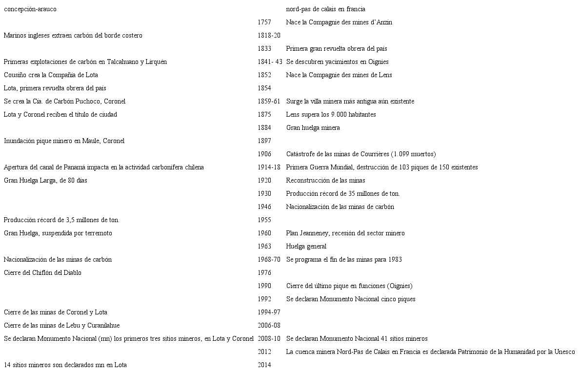 Al analizar la cuenca carbonífera Concepción-Arauco a la luz de lo ocurrido en Nord-Pas de Calais en Francia, no se olvida en ningún instante que cada contexto es parte integrante de sistemas económicos profundamente diferentes y virtualmente incomparables entre sí. Sin embargo, las historias de las explotaciones carboníferas en diferentes partes del mundo poseen ciertas regularidades, dadas las características intrínsecas de la actividad y los límites impuestos por los modos de producción en cada fase histórica. Ambas regiones fueron testigo de durísimas condiciones de trabajo, con jornadas extenuantes, con escasas medidas de seguridad, explosiones de gas grisú y derrumbes que dejaban decenas de muertos.1