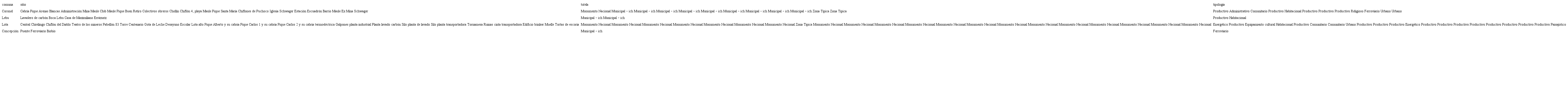 Actualmente el área patrimonial de la cuenca carbonífera Nord-Pas de Calais en Francia abarca 120 km de largo, en una cuenca de 188 km2, con 353 elementos repartidos en 109 sitios diferentes: piques mineros, cabrias, villas obreras, maquinarias, depósitos, cúmulos de escoria, además de edificios de uso civil, comunitario y religioso, distribuidos en cuatro departamentos (Béthune, Lens, Douie y Valenciennes), donde viven 1.240.000 personas. Reconociendo el valor universal excepcional de sus paisajes culturales, la cuenca fue declarada Patrimonio Cultural de la Humanidad por la Unesco en 2012 (Mission Bassin Minier, 2012). La cuenca Concepción-Arauco, por su parte, se extiende por poco más de 140 km en línea recta desde Dichato por el norte a Lebu por el sur, atravesando ocho comunas (Tomé, Penco, Talcahuano, Coronel, Lota, Arauco, Curanilahue y Lebu), que cubren una superficie de 3.114 km2 aproximadamente. Cuenta con 34 elementos con algún tipo de reconocimiento patrimonial: 21 Monumentos Nacionales (mn), 3 Zonas Típicas (zt) y 10 Inmuebles de Conservación Histórica (ich), concentrados preferentemente en Lota y Coronel (tabla 3).