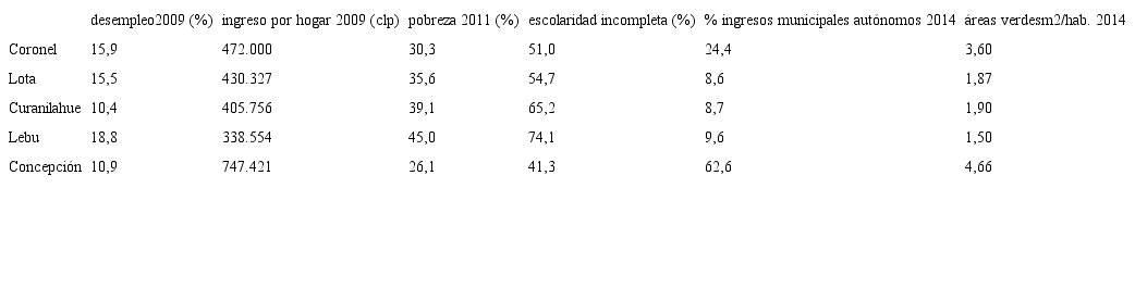 El fracaso de la reconversión se expresa en que a dos décadas del cierre de las minas de Lota y Coronel, los indicadores socioeconómicos de la cuenca del carbón son profundamente deficitarios. Tal como refleja la tabla 4, se trata de comunas con altas tasas de desempleo (sobre un 15%), altas cifras de pobreza (entre un 30% y 45%) y con ingresos mensuales que en promedio oscilan entre un 45% y un 63% de los percibidos en Concepción, muy por debajo de la media nacional.8 Se trata de una situación recesiva que muestra comunas con una preocupante carencia de áreas verdes9 y de equipamiento comunitario, y cuyos porcentajes de ingresos municipales autónomos son extremadamente bajos (menos del 10%): un escenario de estancamiento que nos habla de localidades con pocas actividades económicas y productivas.